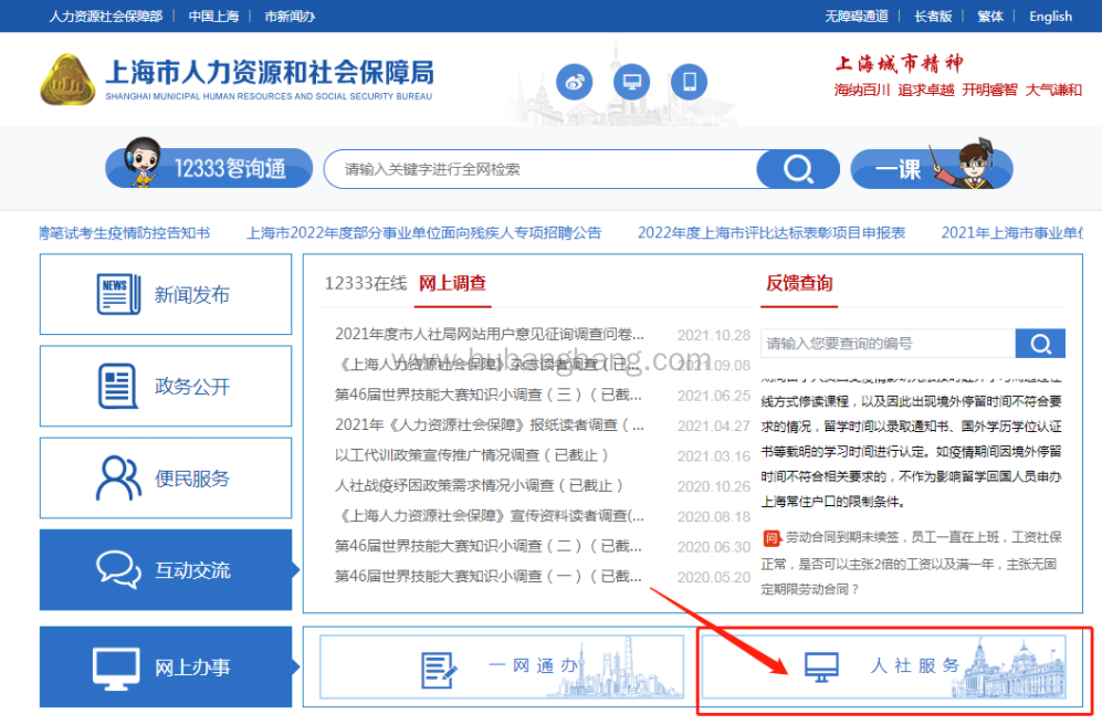 第二步:点击页面中的“人社服务”,进入上海市人力资源和社会保障局公共服务平台;