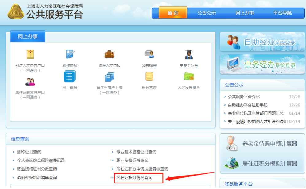 第三步:进入上海市人力资源和社会保障局公共服务平台,点击居住证积分情况查询;