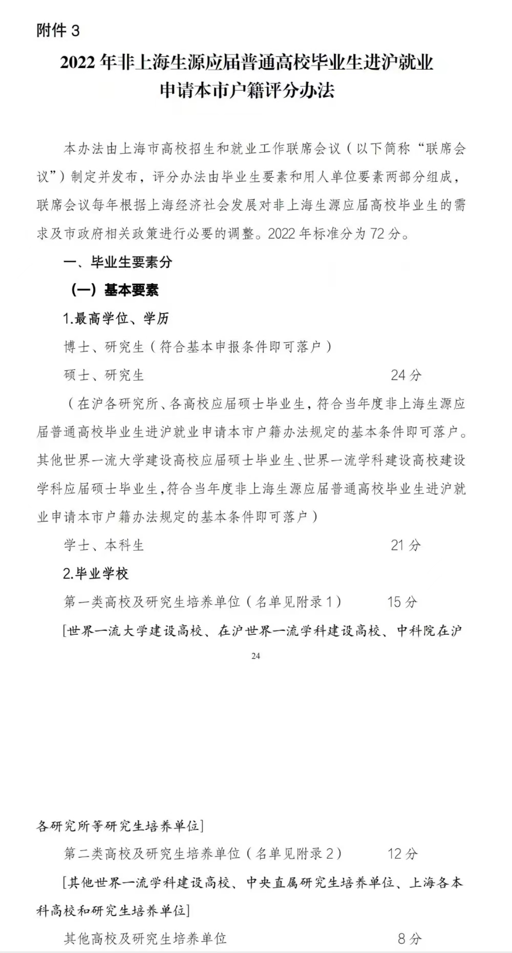 2022上海应届生落户最新72积分细则