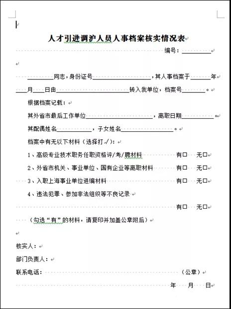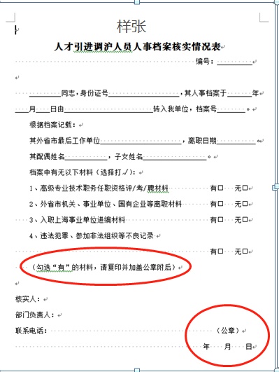 2、严格按照系统中的《人才引进调沪人员人事档案核实情况表》样张模板的要求,核查申请人的人事档案;