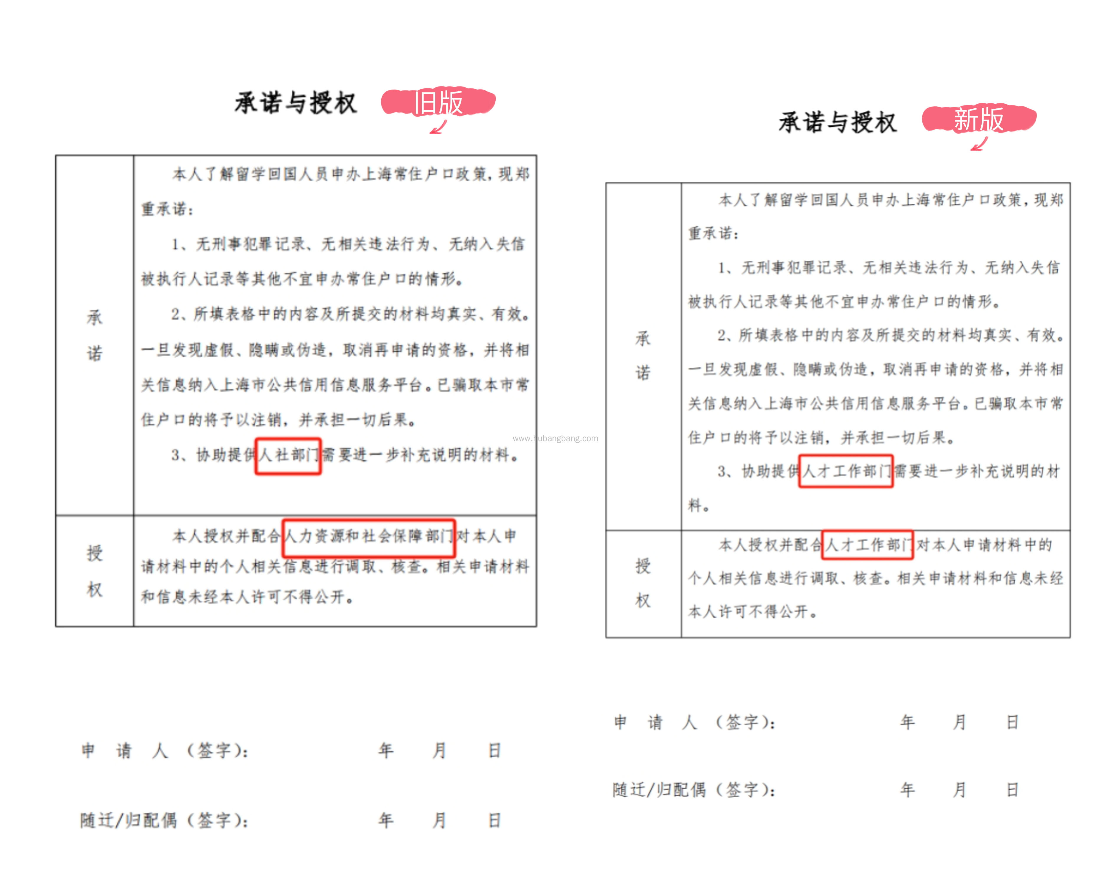此次更新的两项申请材料为《承诺与授权》及《为留学回国人员XXX申办上海常住户口的函》,更新的原因均与今年1月上海新成立的上海市人才工作局有关。