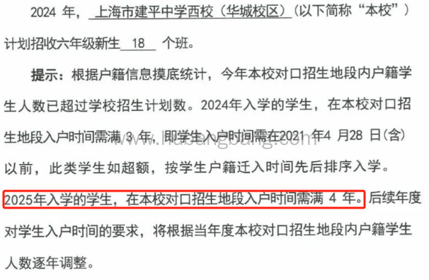 浦东新区在2021年首先提出了“入户时限逐年递增”的概念。今年招生简章中,建平西校(华城校区)等部分浦东公办初中,甚至提出了2025年入户满4年的要求。